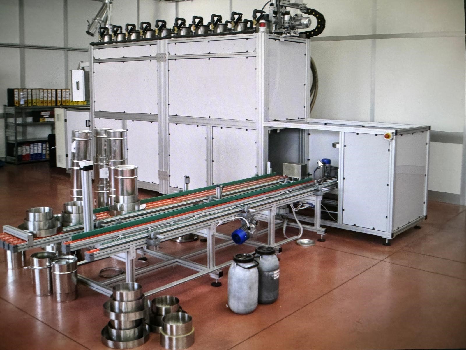 - Automatic loading/unloading system of plastic containers (from 5 to 10 liters) by a scale equipped with roller and conveyor belt.